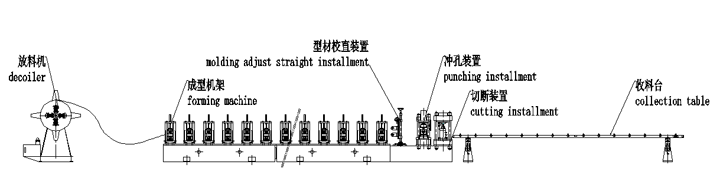 整条生产线由放料系统、成型系统、冲孔系统、切断系统、电控系统等部分组成。