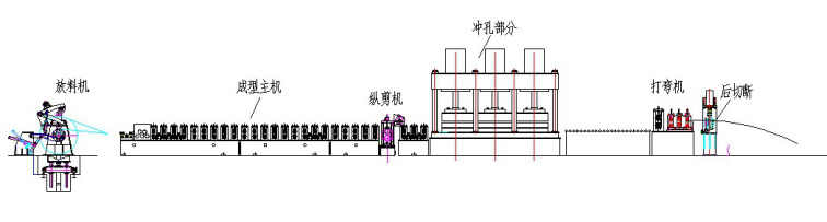 整条生产线由放料系统、成型系统、冲孔系统、切断系统、打弯成型系统、电控系统等部分组成。