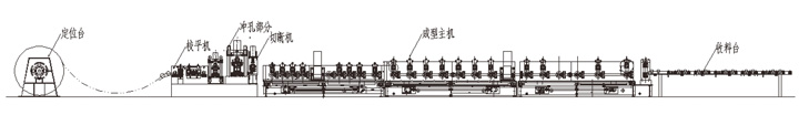 整条生产线由放料系统、校平系统、冲孔/切断系统、成型系统、电控系统等部分组成。